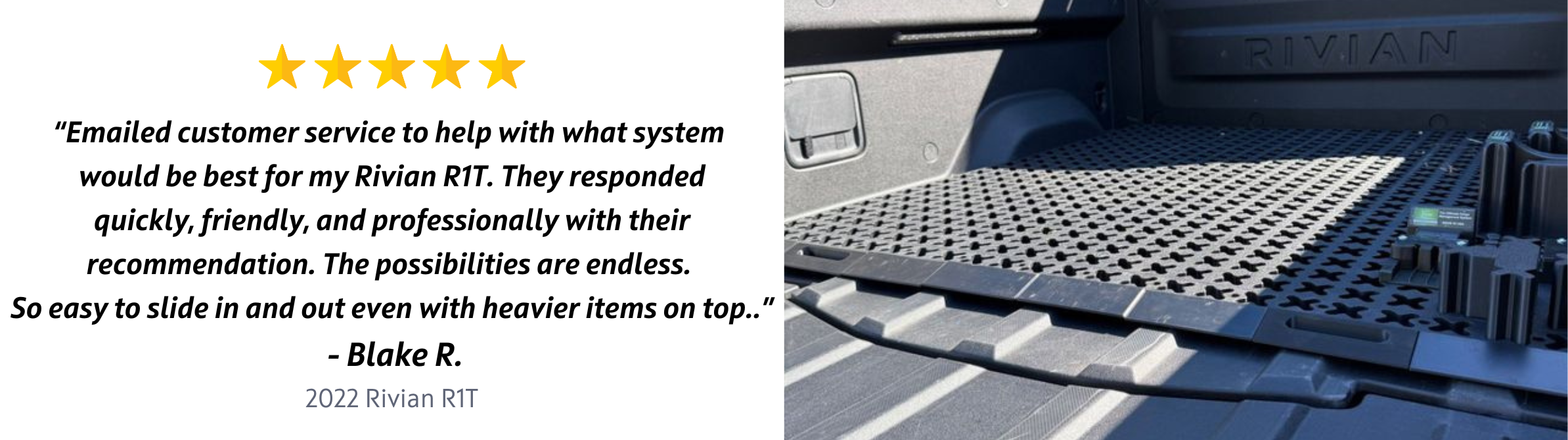 Organize your Rivian R1T’s bed with a cargo management system designed for modern truck bed organization. Adjustable blockers fit into the mat in any arrangement, creating compartments for tools, gear, and equipment. The system fits between the wheel wells and slides toward the tailgate for quick access. Works with drawer systems, bed slides, and other custom setups.