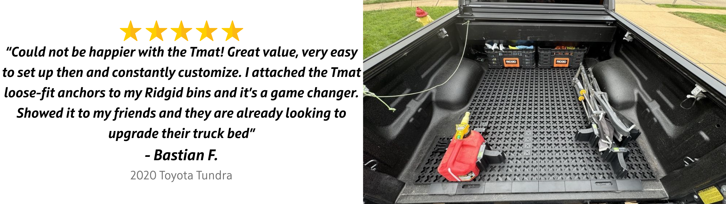 WARNING: Tmat is designed for enclosed and covered cargo areas such as covered truck beds, SUVs, vans, campers, and enclosed trailers. Extra precautions must be taken when used in an open-air cargo area to protect from wind and roll-overs. Tmat should never be used in an open-sided bed or with the tailgate down.